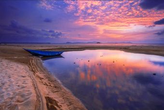 A woman facing the mountains and water at sunset in a Namaste yoga position
